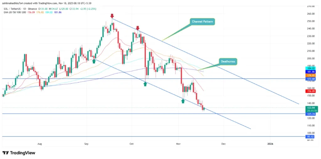Over the past week, the Solana price has given a high-momentum downtrend from $172 to the current trading price of $131, accounting for a 23.82% loss. Amid this correction, the coin price gave a decisive breakdown from the support trendline of a long-awaited channel pattern.