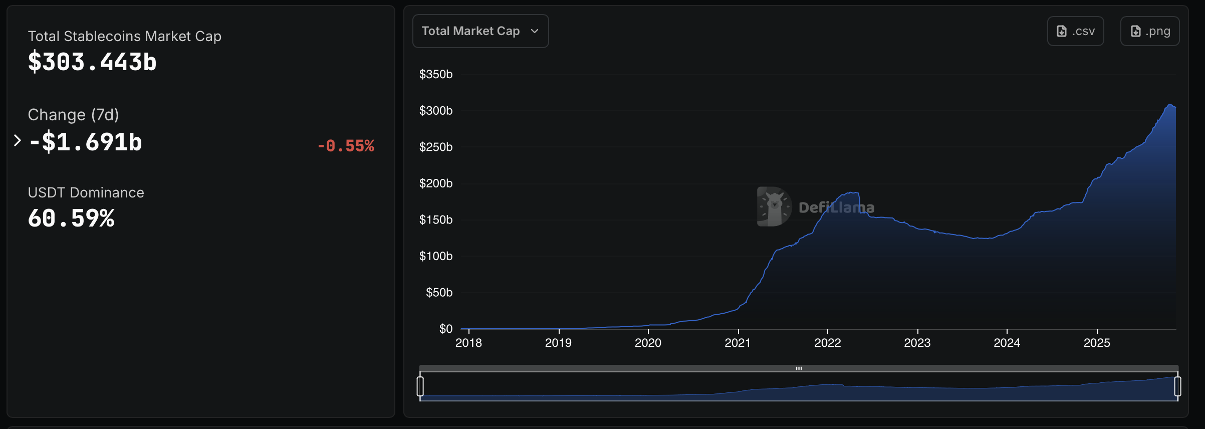 Regulatory clarity in the United States under the GENIUS Act and in Europe through the Markets in Crypto-Assets (MiCA) framework has helped drive a surge in stablecoin adoption. According to DefiLlama data, the stablecoin market cap stands at $303.44 billion, up nearly $100 billion since the start of the year.