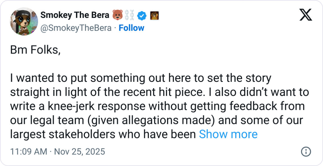 Smokey and the Berachain Foundation were contacted for comment via X. Brevan Howard did not respond to a request for comment outside of regular business hours.