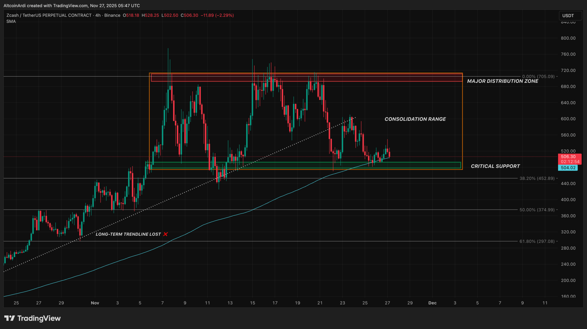 Crypto analyst Ardi noted that despite the recent ZEC price retracement, it continues to hold the key $480 liquidity zone. This has prevented further breakdown for the altcoin. On the upside, ZEC faces resistance around $540, followed by a supply zone between $580 and $611.