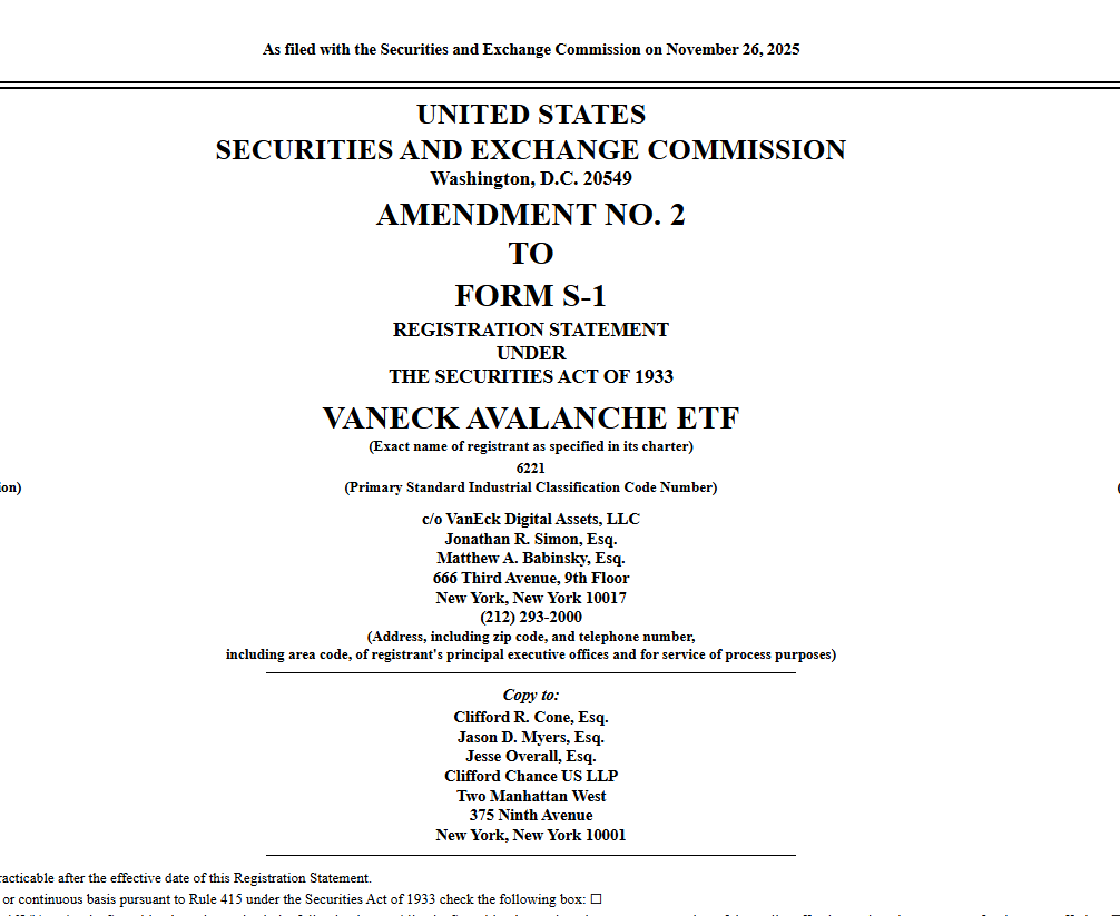 According to the latest US SEC filing, asset manager VanEck submitted a second S-1 amendment for its spot Avalanche ETF.