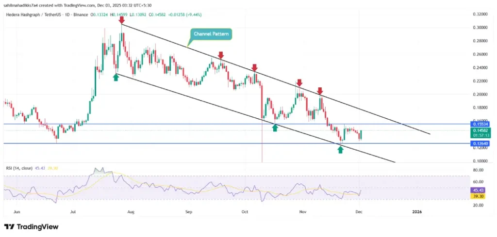 On December 2nd, the Hedera coin price showed a bullish rebound from $0.1332 to $0.145, registering a 9.24% jump. This surge created a fresh higher-low formation in HBAR’s daily chart, accentuating an initial change in market sentiment. The momentum indicator RSI is back in the 45% region, reinforcing the renewed recovery momentum in price.