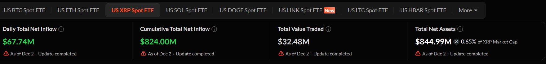 These four XRP ETFs have since continued to witness rapid inflows, with their latest $67.64 million capital flow pushing the cumulative total net inflow figure from $756.26 million on Dec. 1 to $824 million at press time. The four products reached this $800 million milestone after just 13 trading days.