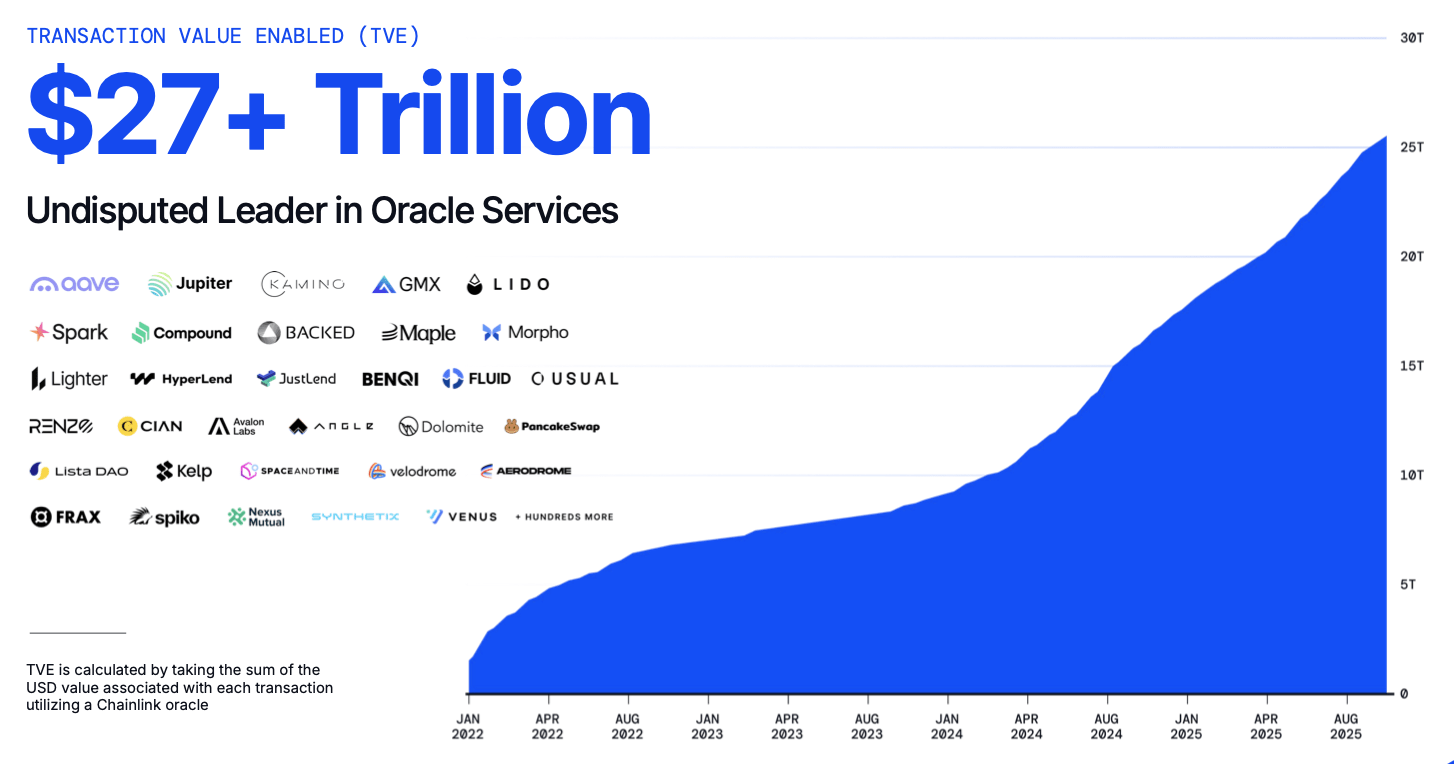 According to the data, Chainlink’s Transaction Value Enabled (TVE) surpassing $27 trillion showing how central its services have become in the broader tokenization economy.
