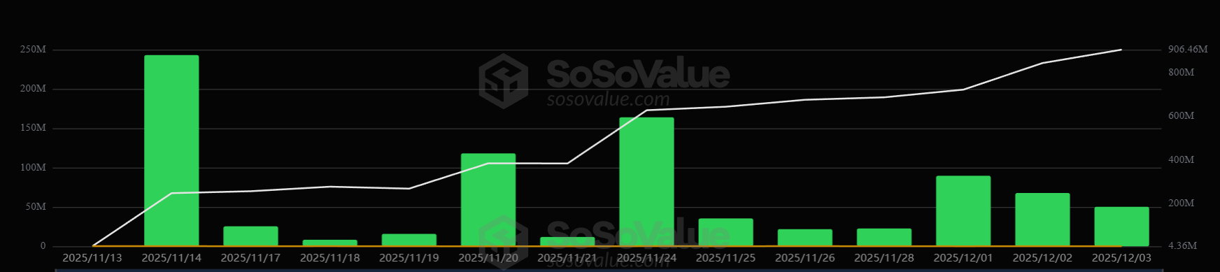 XRP spot ETFs have logged 13 consecutive days of inflows, adding another $50.27 million on December 3 and bringing cumulative inflows to $874.28 million, according to SoSoValue.