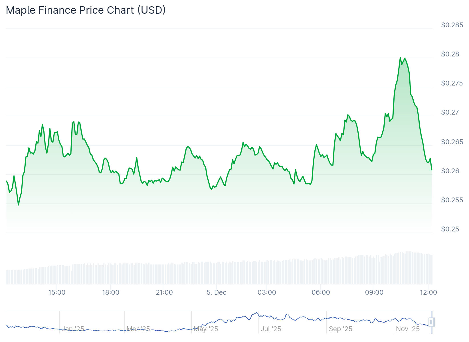 After Maple announced that it had bought back 2 million tokens, removing them from the circulating supply, SYRUP rallied to touch $0.28 with a market capitalization of over $318 million, according to CoinGecko. The asset as since retraced to just above $0.26 by press time. Though the token is up about 19% this year, it has had a rough last month, dropping about 32% in 30 days.