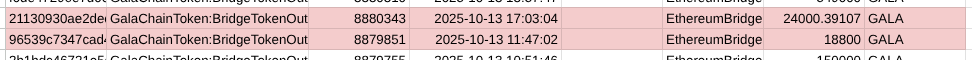 Taking the first suspicious withdrawal as an example, which occurred on October 13 at 15:55 UTC, the surrounding transactions of 18,800 and 24,000 GALA are present in the GalaScan data.