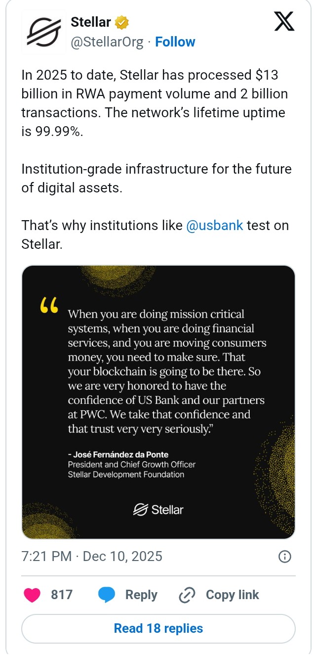 Stellar Lumens boasts of a successful year as it processes $13 billion in Real World Asset (RWA) payment volume in 2025 to date. According to a post shared on X, Stellar disclosed that it has also processed about 2 billion transactions while maintaining a lifetime uptime of 99.99%.