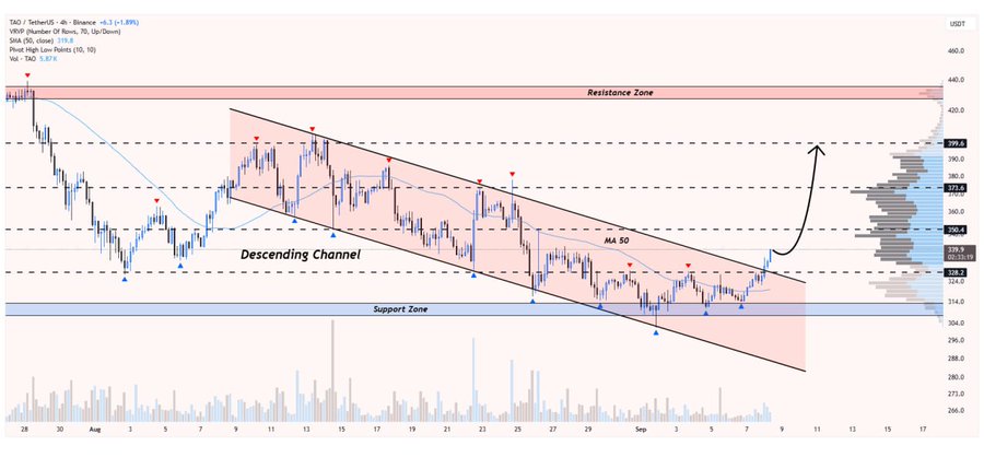 Crypto analyst Daniel Ramsey, in a post on X, noted that the structure of TAO is in a weekly channel and has potential for an upward retracement. Additionally, Whales_Crypto_Trading pointed to a breakout on the four-hour timeframe, indicating scope for further gains, provided strength continues.