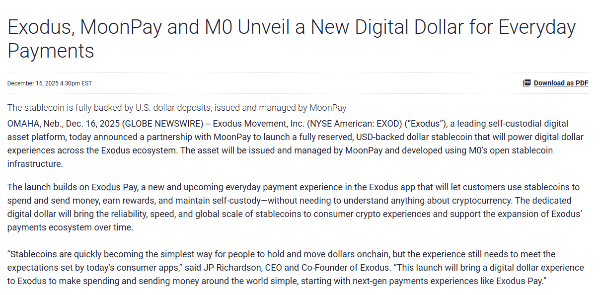 Digital asset platform Exodus is preparing to enter the stablecoin market through a new partnership with crypto payments firm MoonPay. The Exodus Movement, which is best known for its self-custody crypto wallet, announced that it plans to launch a fully reserved, US dollar-backed stablecoin in early 2026. While the token has not yet been named, it will be issued and managed by MoonPay and built using the infrastructure of M0, a platform that enables companies to design, issue, and operate custom stablecoins.