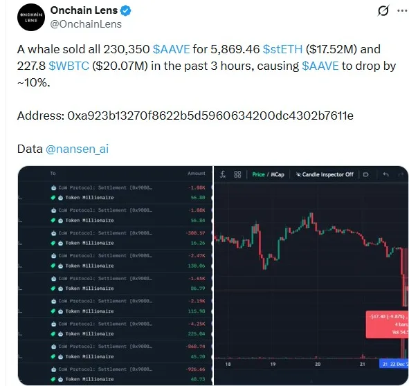 - AAVE slid about 10% after a whale sold 230,350 tokens worth roughly $38 million.