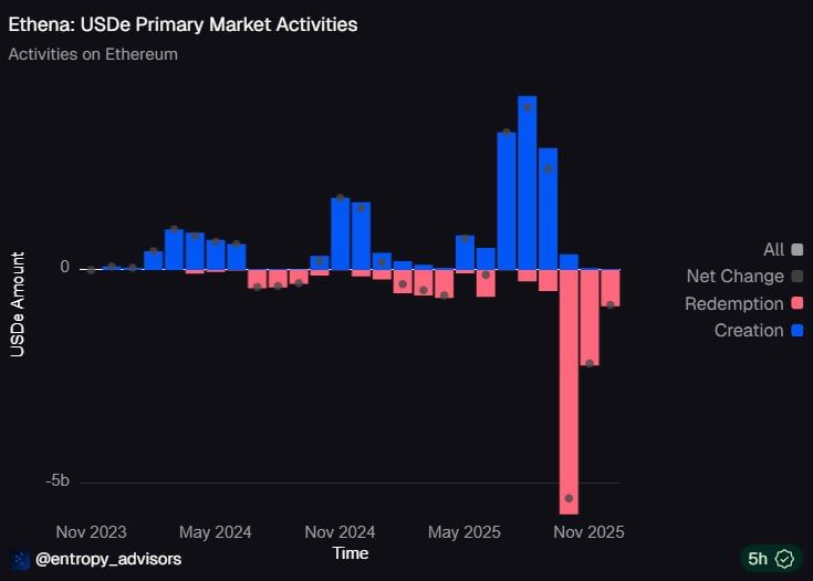 According to Dune, since October, more than $8 billion in net redemptions have been recorded from USDe, including an outflow of over $5 billion in just one month. Additionally, the decline in yields, previously considered quite attractive to DeFi players, has accelerated their withdrawals.