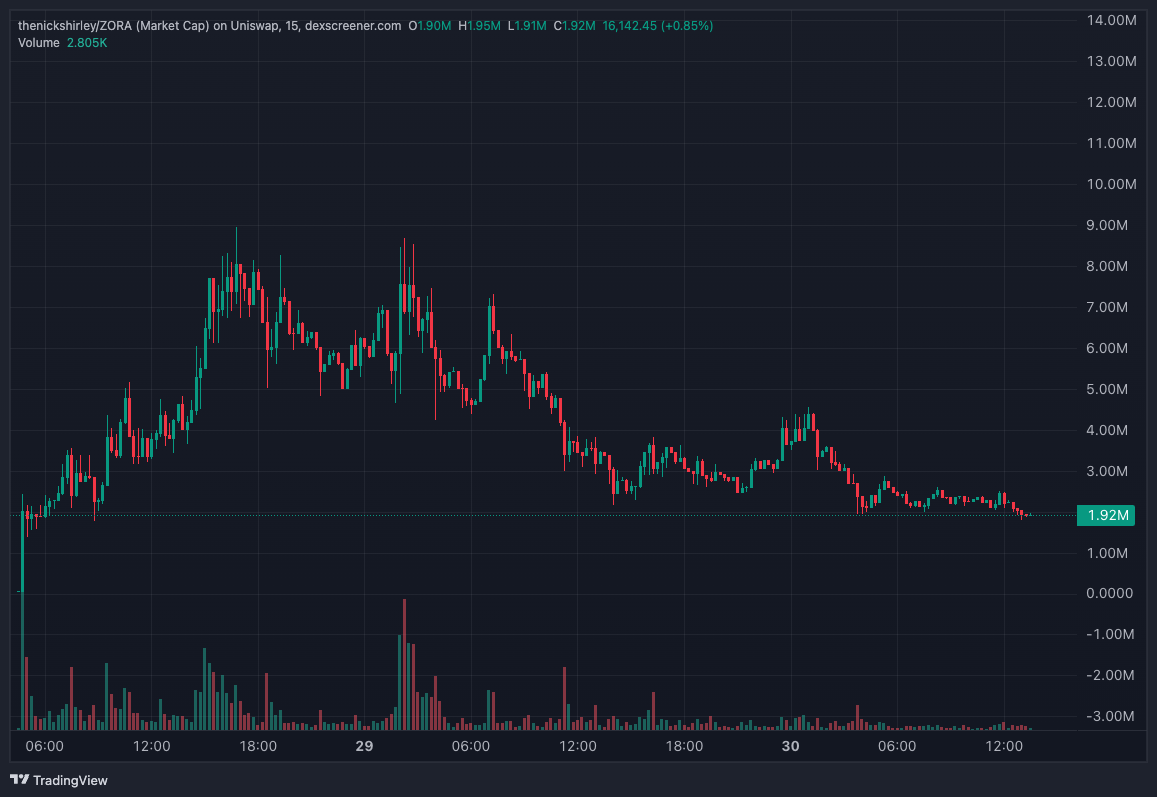 As a result, ZORA is having a rough day, falling more than 4% to $0.038 over the last 24 hours, despite BTC and ETH posting modest gains of around 1% today.