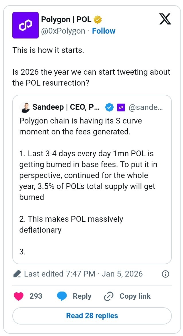 Polygon Foundation CEO Sandeep Nailwal has labeled 2026 as a year of Polygon (POL) resurrection. Explaining this in three points, he pointed out that 1 million POL in base fees have been burnt in the last three to four days. According to the CEO, this trend is expected to continue for the remainder of the year. Mathematically, repeating this trend for the whole year could see 3.5% of POL’s total supply burnt.
