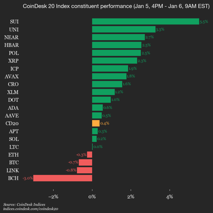 Leaders: SUI (+5.5%) and UNI (+3.3%).