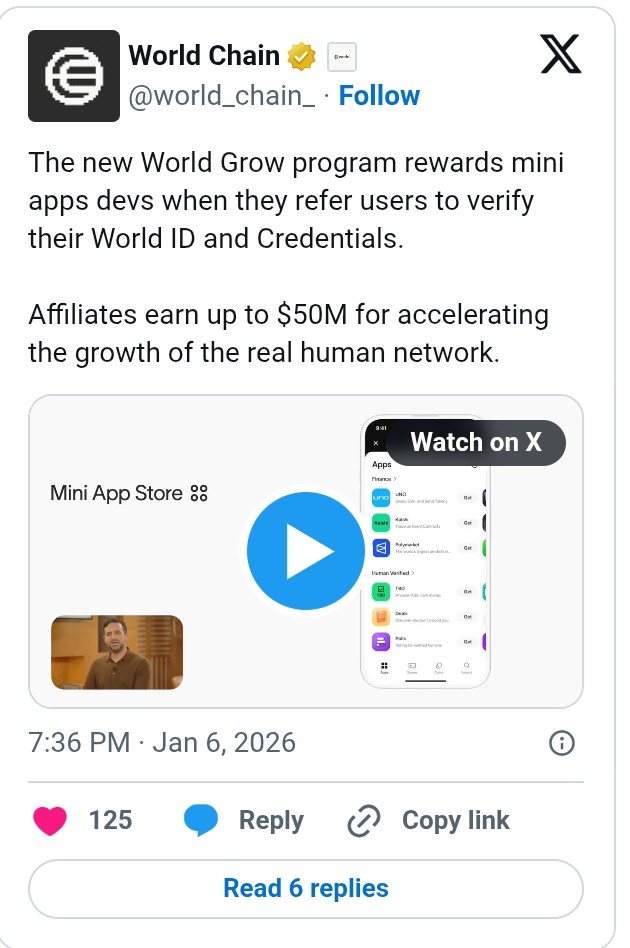 World Chain has announced a new reward program called World Grow to significantly increase its World ID Verification. According to the information, this program has been designed as an affiliate exercise, where developers are rewarded for referring users who want to access their applications through World ID and Credential verifications.