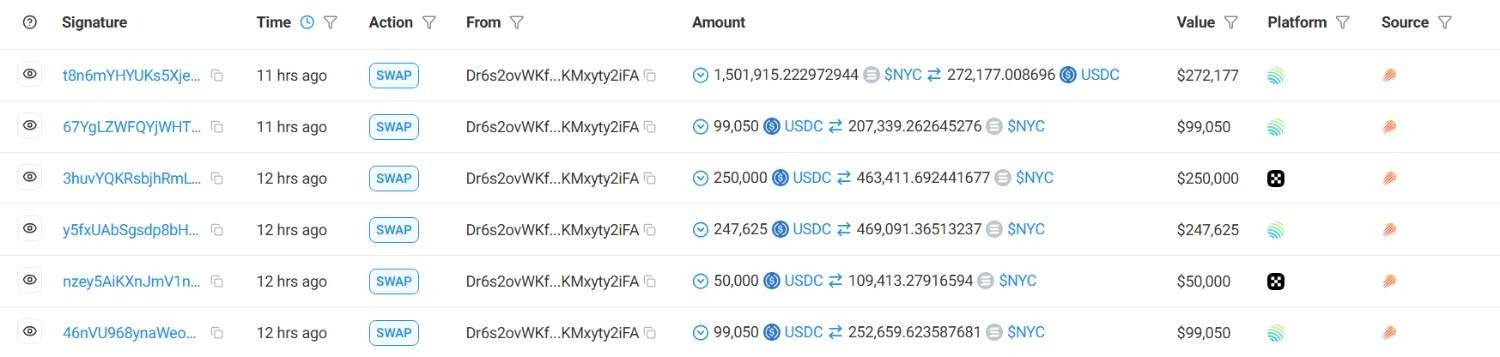 Specifically, the trader first swapped a total of 745,725 USDC for $NYC across five trades and then panic-sold the meme coin for only 272,177 of the stablecoin.