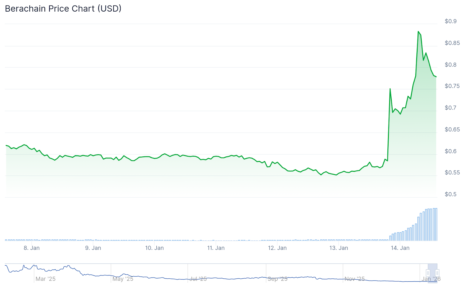 BERA is up 40% to $0.80 since the team released its end-of-year update yesterday, which introduced the “Bera Builds Businesses” model, in which the Berachain Foundation plans to “build, acquire, or partner” applications that support the token via internal incubation, revenue-sharing, and equity structures.