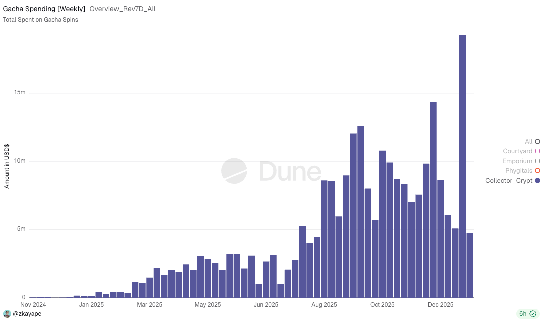 Onchain trading card platform Collector Crypt’s CARDS token is up 60% in the last week as its gacha spin volume hits new highs, driving protocol revenue and token buybacks to their highest levels since September.