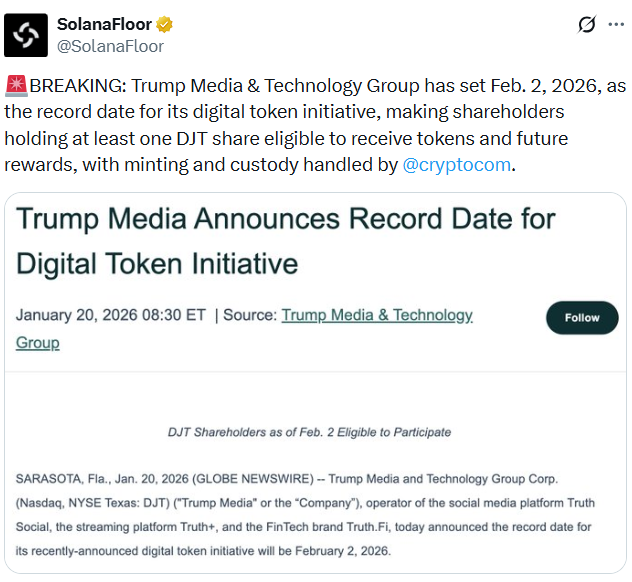 US President Donald Trump’s media company has advanced plans for its “first-of-its-kind” shareholder token airdrop, setting Feb. 2 as the record date used to determine eligibility.