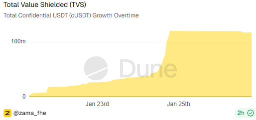 Zama added that its auction app was the most-used application on Ethereum by transaction count on Jan. 24, ahead of USDT, USDC and Uniswap. The project also said Total Value Shielded (TVS) topped $100 million within three days – its public Dune dashboard shows TVS at roughly $117.4 million as of Monday.