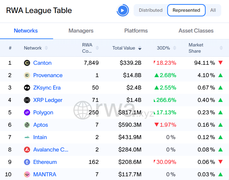 - This places the ledger in fourth place among the largest networks by represented RWA, towering over Ethereum and Polygon.