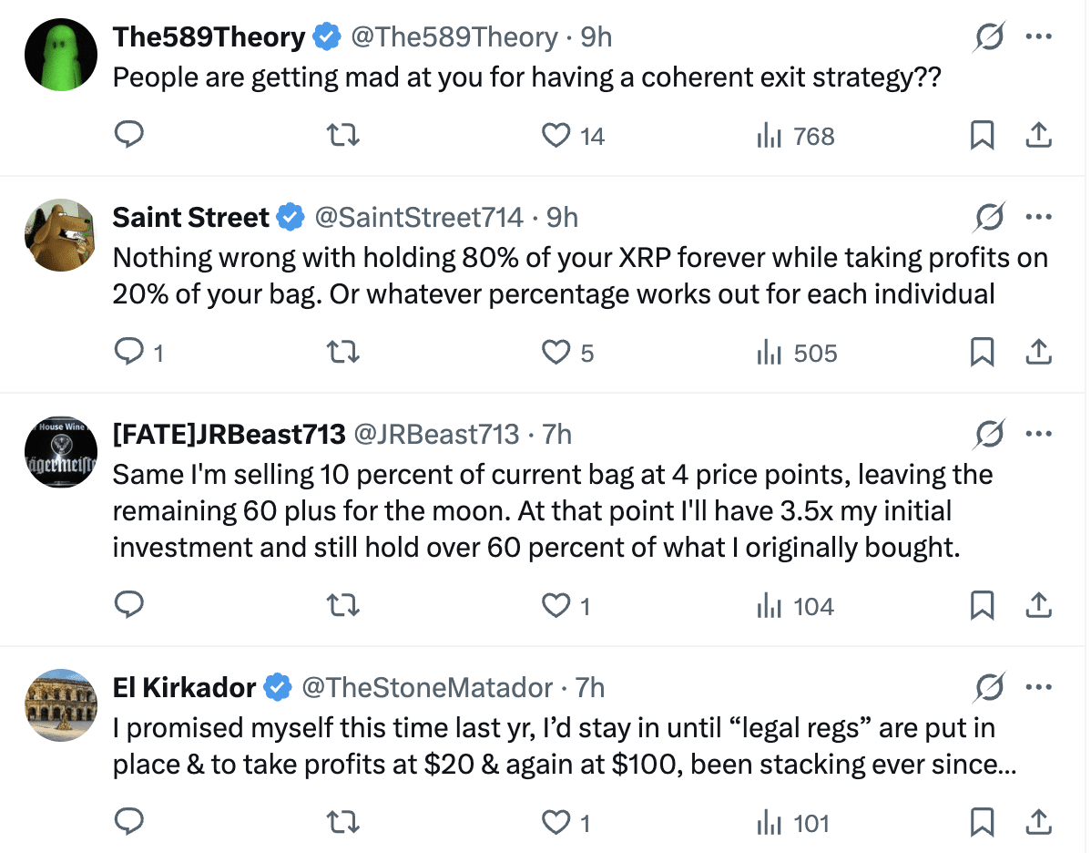 Many community voices favor selling small portions while holding most $XRP for the long term.