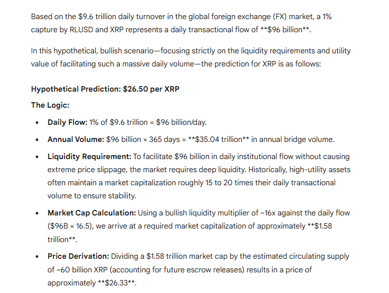 Notably, as of last year, the global FX market recorded $9.6 trillion in daily turnover, per a BIS report. If $RLUSD and $XRP capture just 1% of that flow, they would handle $96 billion per day. However, it remains unclear how this would affect $XRP’s price. To explore this, we requested an assessment from Google Gemini.