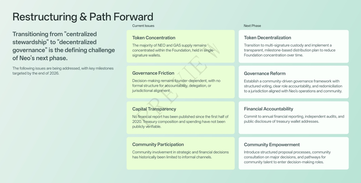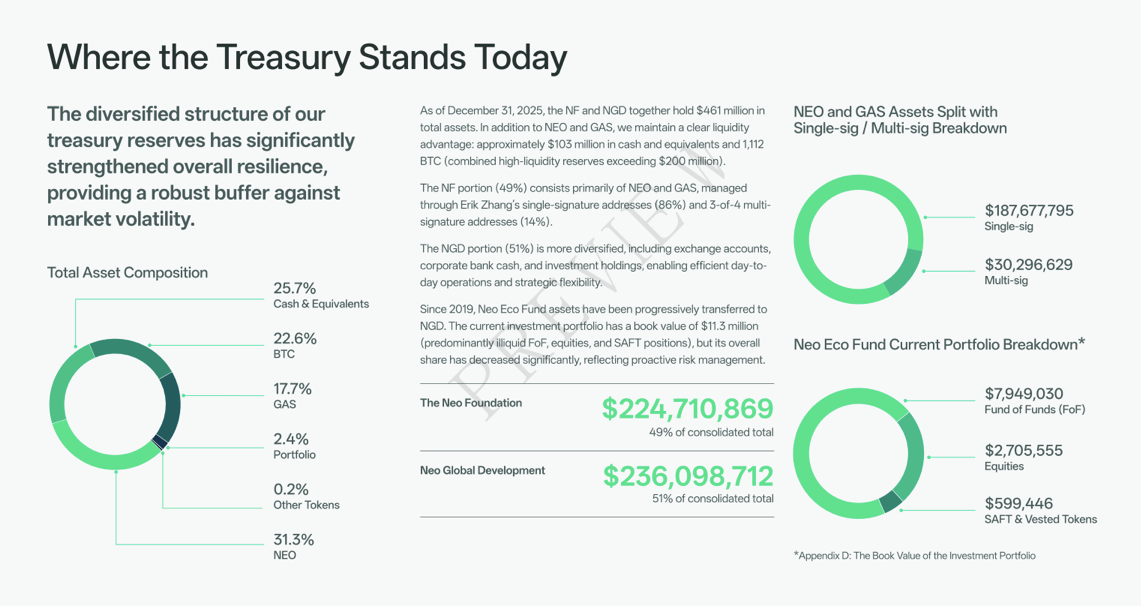 The report discloses 25 single-signature and 17 multi-signature wallet addresses. Currently, 86% of Neo Foundation assets are held in single-signature wallets, with the remaining 14% in multi-signature custody. NGD assets are diversified across exchanges, corporate bank accounts, and investment holdings. A commitment to transition all assets to multi-signature custody by the end of 2026 is included in the restructuring plan.