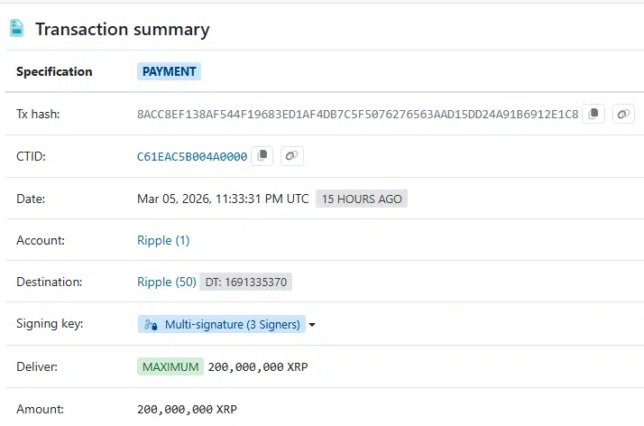 According to screenshots attached to the post, Ripple transferred 200 million $XRP, worth about $280.8 million, to an unlabeled address. The transaction occurred at 11:33 PM on March 5, 2026, and validators confirmed it in ledger #102673499.