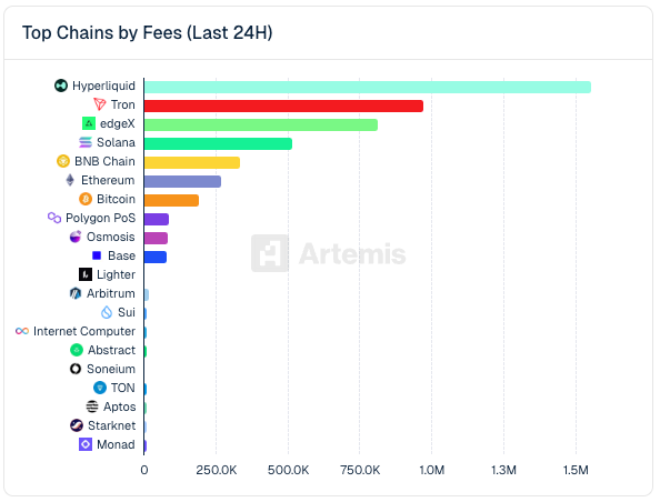 That has helped the Hyperliquid chain dominate in revenue, which stands at $1.6 million over the last 24 hours, compared to $335,000 for BNB Chain and $192,000 for the Bitcoin blockchain, according to Artemis data.