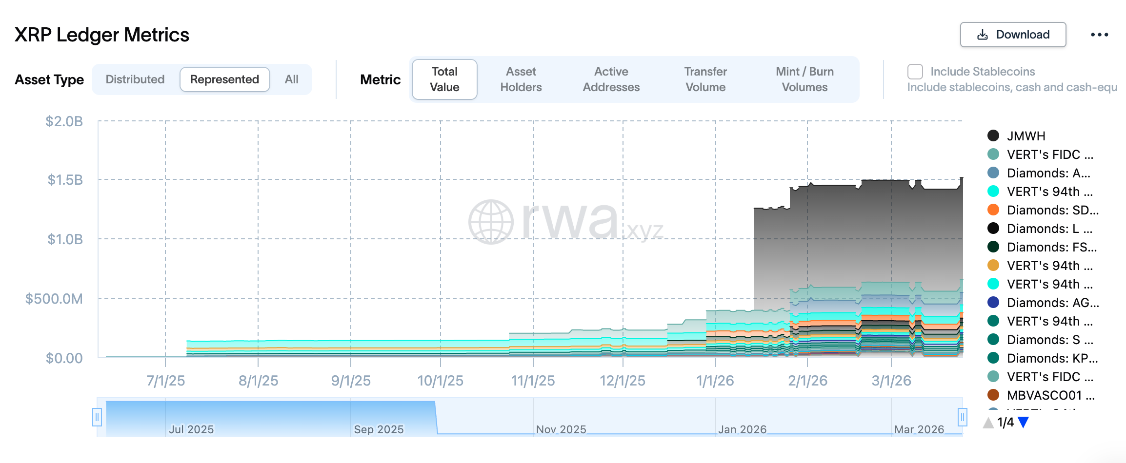 As of today, March 26, JMWH's total asset value still stands at $861 million — representing nearly 57% of all so-called represented asset value on XRPL, and a nearly 45% market share of all tokenized RWA platforms on the network.