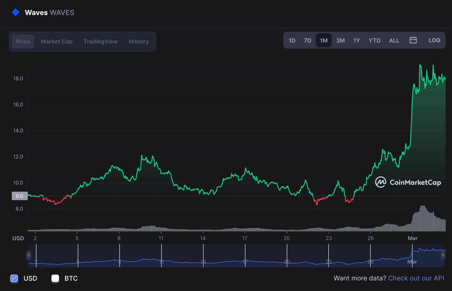 Indeed, as of Thursday, March 3, Waves is trading at $18.14, up 1.84% on the day and 106.91% in the last week, with a market worth of $1.9 billion, at the time of publication.