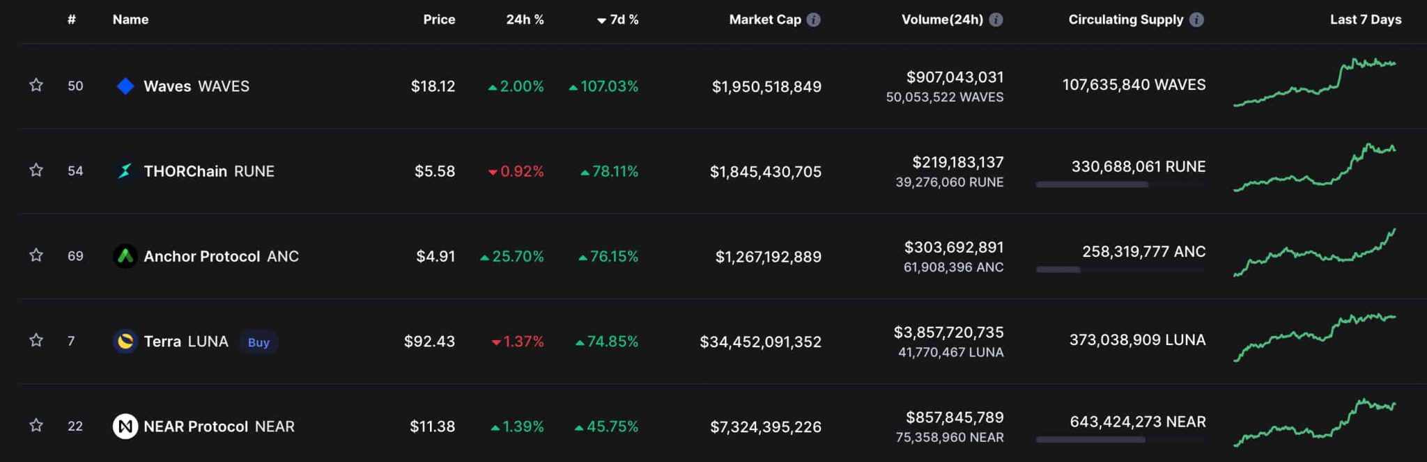 As a result, the cryptocurrency in discussion has risen by 101.1% between the two dates mentioned above. Furthermore, when looking at the top gainers among the top 100 digital assets by the market capitalization in the last 24 hours were Waves (WAVES), THORChain (RUNE), and Anchor Protocol (ANC).