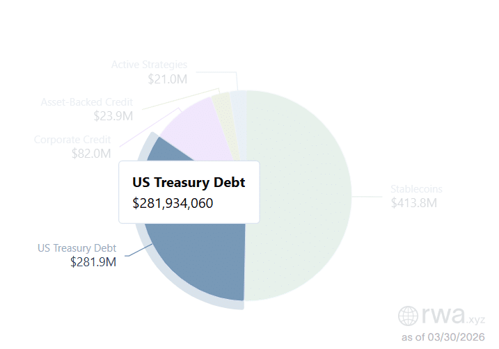 Notably, U.S. Treasury Debt contributes the largest share to the XRPL’s distributed RWA value. These tokenized products account for $282 million worth of RWA value on the network. These U.S. Debt funds are provided by OpenEden, Ondo, and Guggenheim Treasury Services.