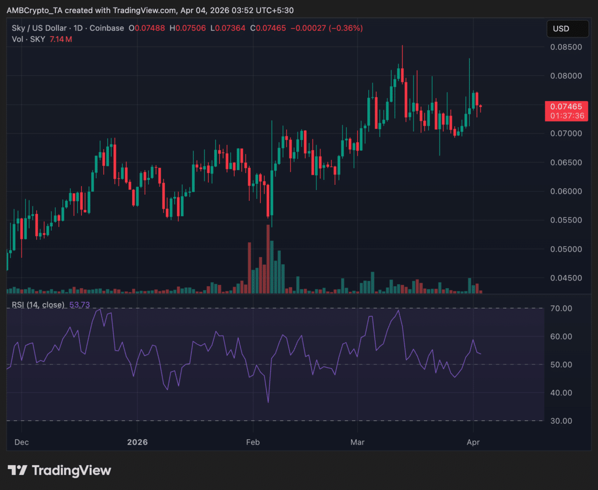 The relatively stable price action aligns with $SKY’s role as a governance and yield-generating asset, rather than a purely narrative-driven token.