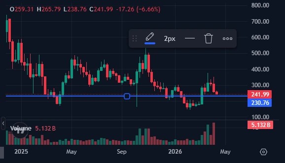 Just a week ago, the coin traded slightly above $300, but has since dropped by 24.31% due to the recent Covenant drama and investor rotation into alternative coins.