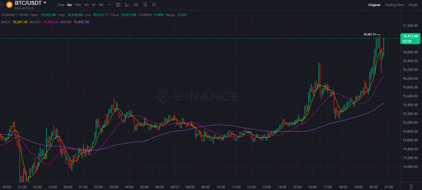 Bitcoin inched higher toward $77,000 on the news after trading earlier in the $74,600–$75,746 range, while oil prices tumbled. Crude dropped 11.5% to near $84 and Brent declined more than 10% to around $89.