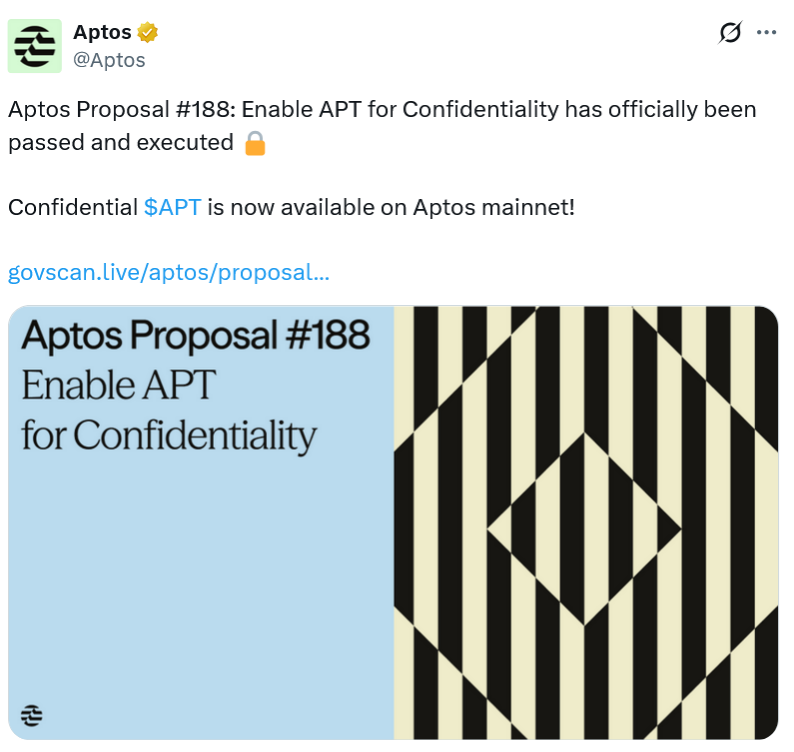 “Confidential $APT” launched on the Aptos mainnet on Friday after a governance proposal to integrate the privacy feature passed in a near-unanimous vote. It uses zero-knowledge proofs to conceal token balances and transfer amounts while still enabling transactions to be verified.
