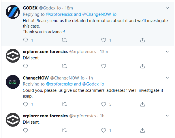 xplorer Forensic noted that a sum of 130K XRP has been moved by hackers to ChangeNow exchange and 43K XRP was also transferred to Godex cryptocurrency exchange platform.