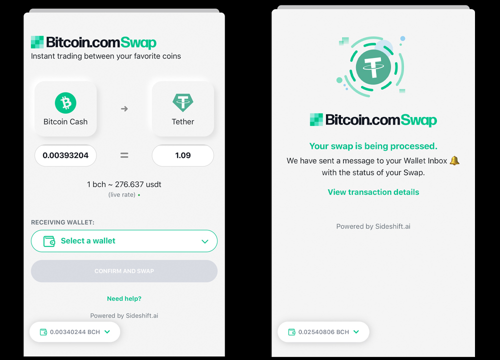 The Bitcoin.com Wallet allows users to swap coins by leveraging the Sideshift.ai application. The process is intuitive and it only takes a few minutes to swap coins using Bitcoin.com’s client. Users can swap bitcoin cash (BCH), bitcoin (BTC), honestcoin (USDH), and tether (USDT) using the wallet software.