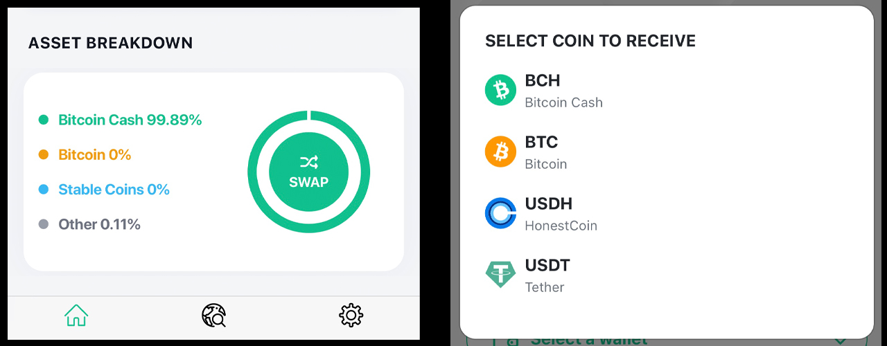 In order to swap bitcoin cash for SLP-based tethers, simply tap the “swap” button on the bottom of the wallet’s home screen and it will direct you to the in-app swapping window.