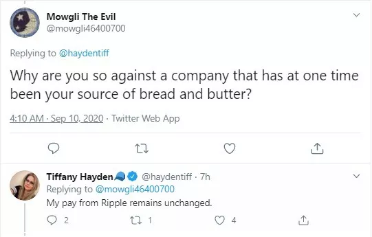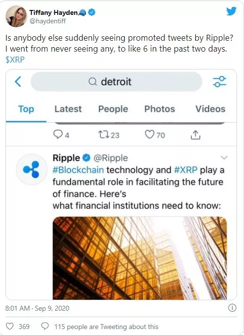 Tiffany Hayden has tweeted that, in the past two days, she has come across promoted Ripple tweets about six times in her feed and asked if she was the only person who bumped into them.