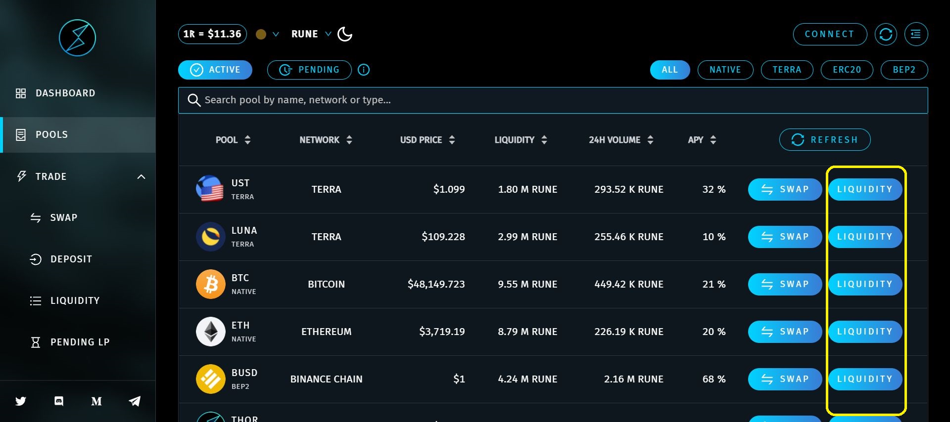 So, we are going to add liquidity and hit our preferred liquidity pool. We use the BTC and RUNE pool again. See the picture below, the yellow box. Note that not all pools are available, you will need to check each pool.