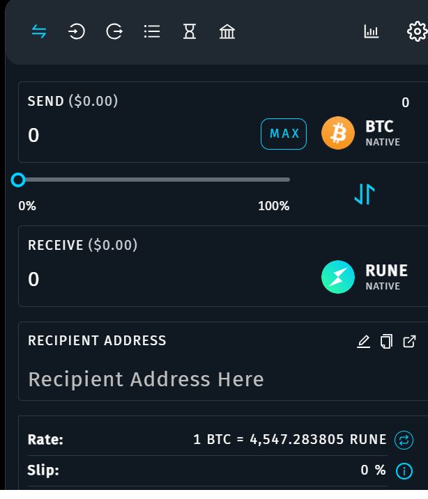So, we are going to swap BTC for RUNE. There are no gas fees, only transaction fees in BTC. Any network fees, the protocol takes during the actual swap. However, you can adjust your slippage. There is a ‘slip’ button, upon clicking a pop-up appears. You can adjust slippage between buttons of 0.5%, 1%, and 3%. The 1% option is a good one unless you are swapping volatile assets. Now you are ready to join a liquidity pool.