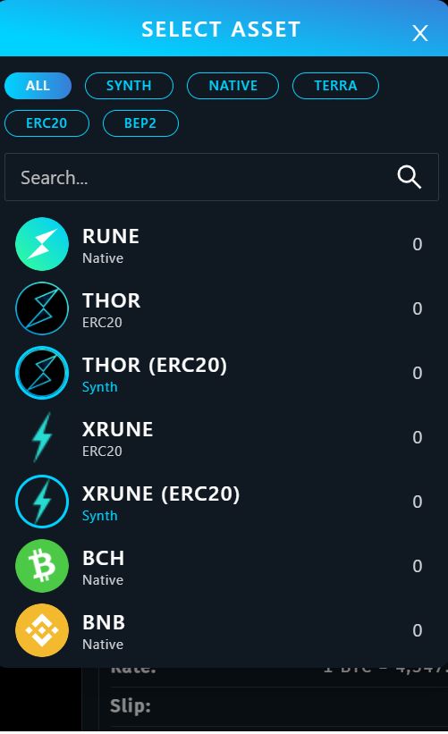 However, if you decide that you prefer to swap a different asset, click on RUNE and other assets will pop up. Just like the picture below. Some of these assets are ‘synths’. Don’t worry about that, they are legit, and you can use them to swap. In a nutshell, they are native assets on the Thor chain.