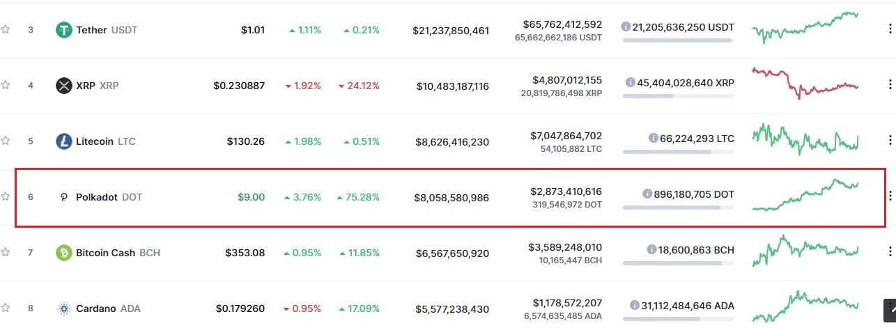 - Polkadot has silently risen to the number 6 spot on Coinmarketcap