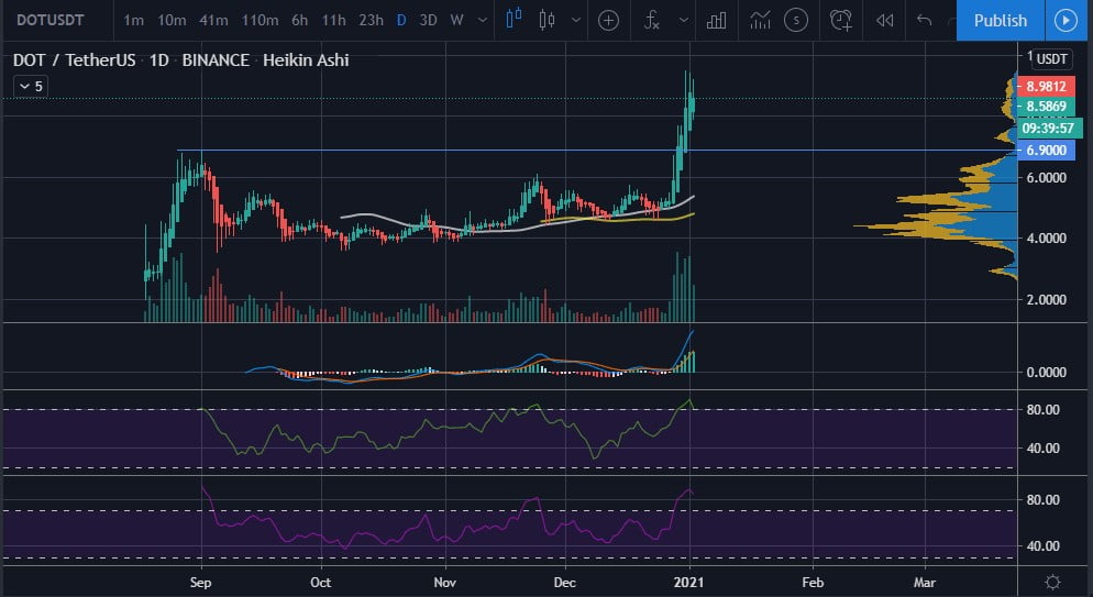 As earlier mentioned, Polkadot has experienced a 90% increment since Christmas day towards its recent all-time high value of $9.53. At the time of writing, Polkadot is consolidating around the $9 price area with the previous all-time high value of $6.90 providing adequate support on a macro level.