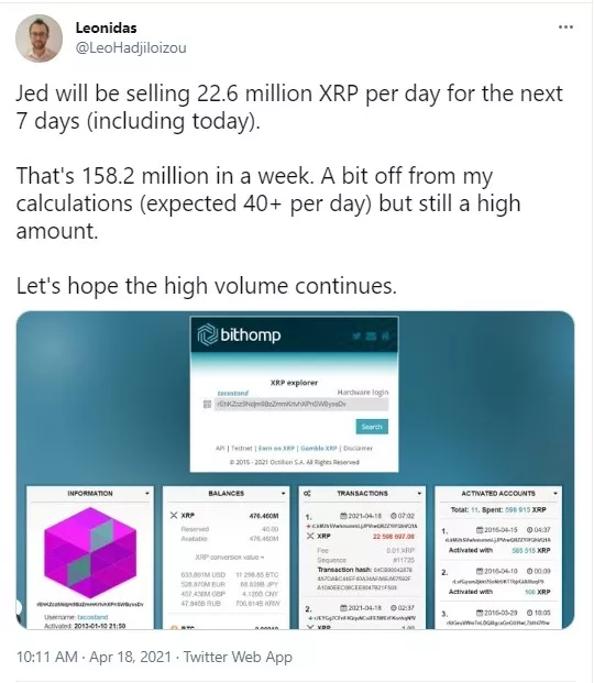 Researcher Leonidas Hadjiloizou has tweeted that, according to the data shared by the Bithomp analytics website, McCaleb sales are going in smaller amounts than he had expected – 22.6 million XRP on a daily basis rather than 40+ million.