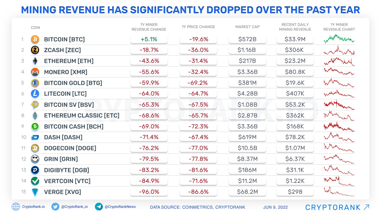 Things are so bad for miners that the second highest yield after Bitcoin (BTC) shows Zcash (ZEC) with -18.7% p.a. The further down the table, the bigger the gap, with Ethereum (ETH) closing the top three with -43.6% annual profitability.